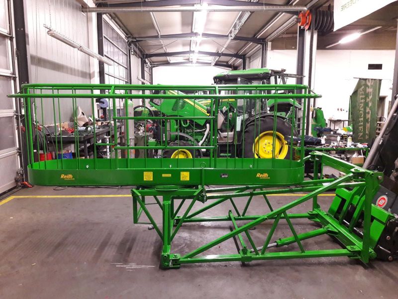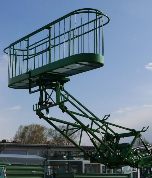 Liegende Bauweise, dadurch bequemer und sicherer Ein- und Ausstieg in die Plattform. Arbeitsbühne mit umlaufenden Hand-Anfahrschutz und automatisch verschließbaren Ein- und Ausstieg. Hydraulische Hangausgleich-Schwenkung des Arbeitskorbes nach links und rechts. Manueller Drehkranz mit Verriegelung unterhalb der Plattform erlaubt das Drehen des Arbeitskorbes um 90° für Straßentransport. Durch die integrierte mechanische Parallelführung der Kanzel bleibt die Plattform immer parallel zum Boden. Ein Nachregeln vom Traktorfahrer ist nicht erforderlich. Mechanische Parallelführung der Frontladerschwinge ist erforderlich. Der Arbeitskorb kann individuell nach Kundenwunsch bis zu einer Breite von 3,50m gefertigt werden.