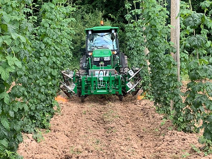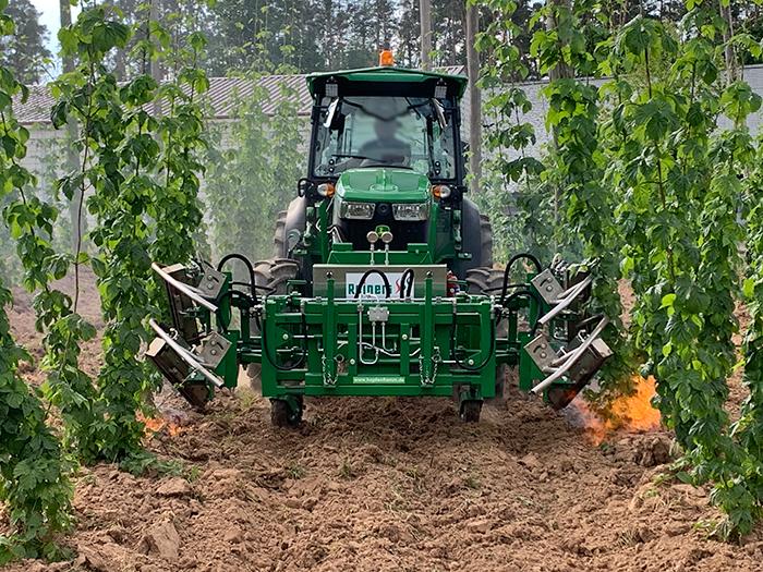 Mit einem zweiten, senkrecht stehenden Brenner werden die Hopfenreben gleichzeitig auch entlaubt.